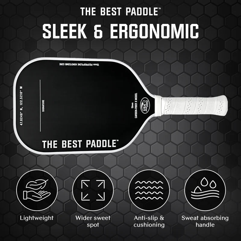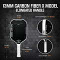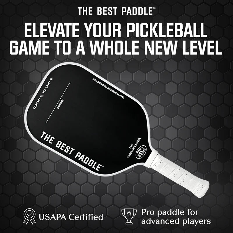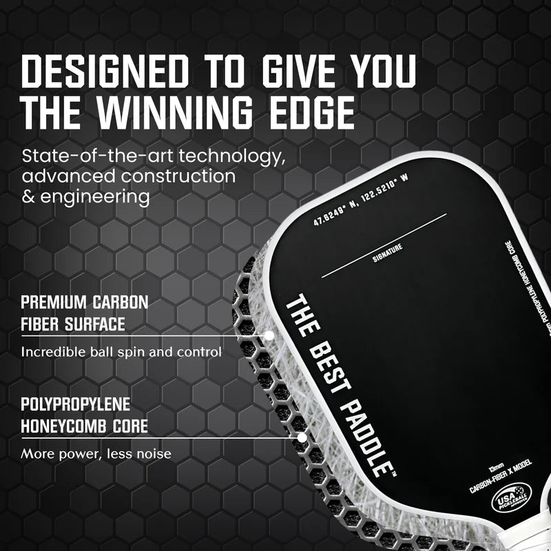 This is TBP's Premium Carbon Fiber paddle with a 13mm polymer honeycomb core. The T700 Raw Carbon Fiber hitting surface is great for more ball spin and control. The thinner 13mm core offers a more power than the 16mm core. Most advanced singles players prefer this paddle.