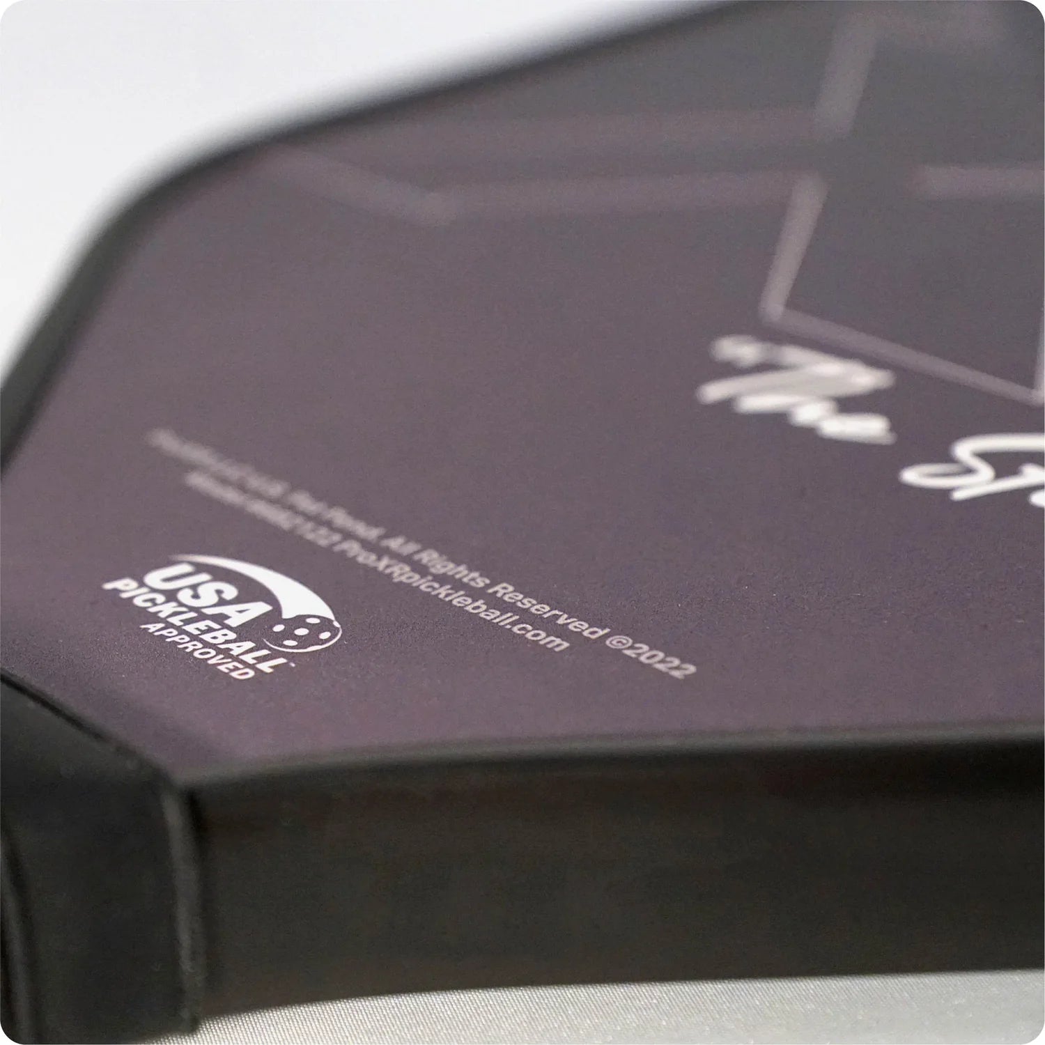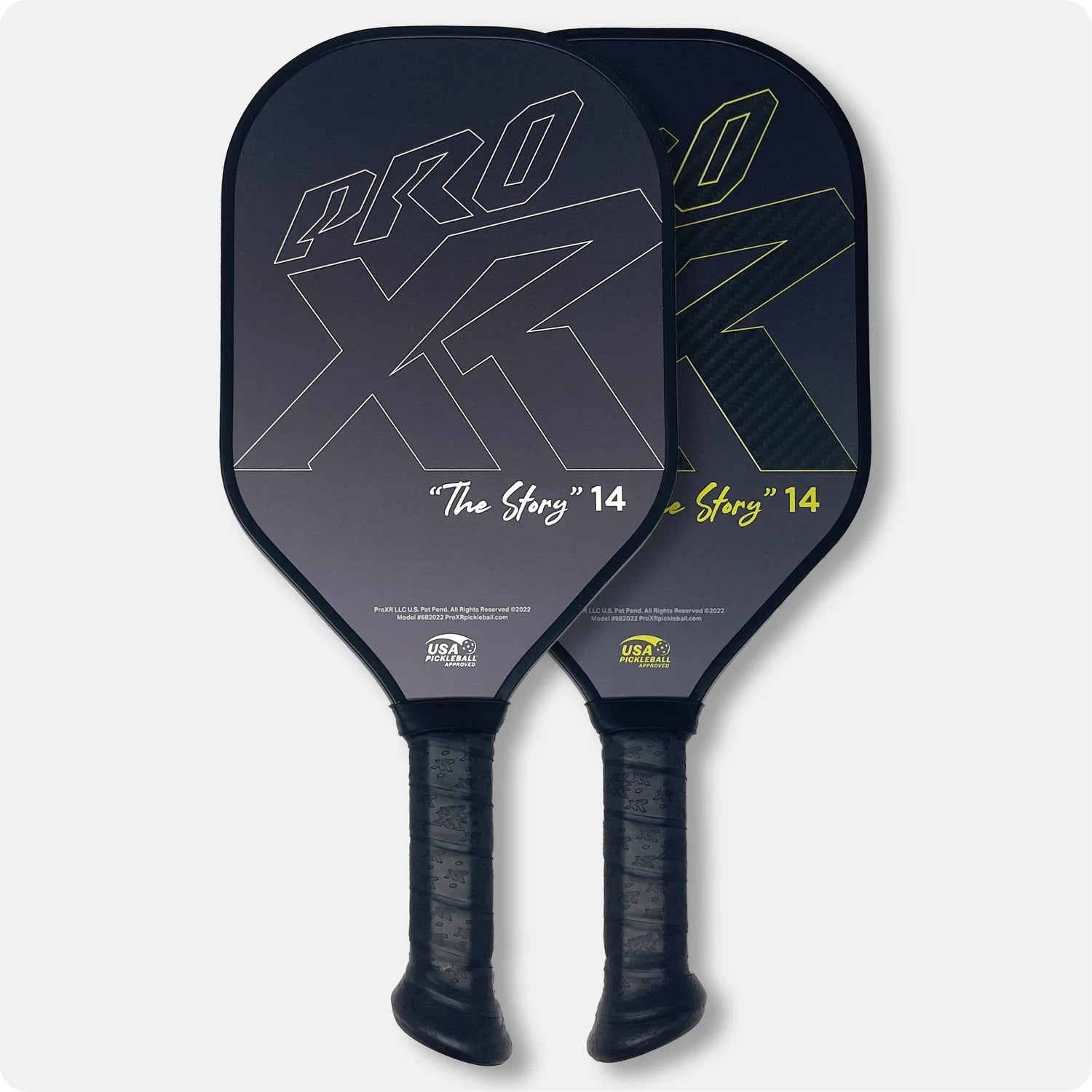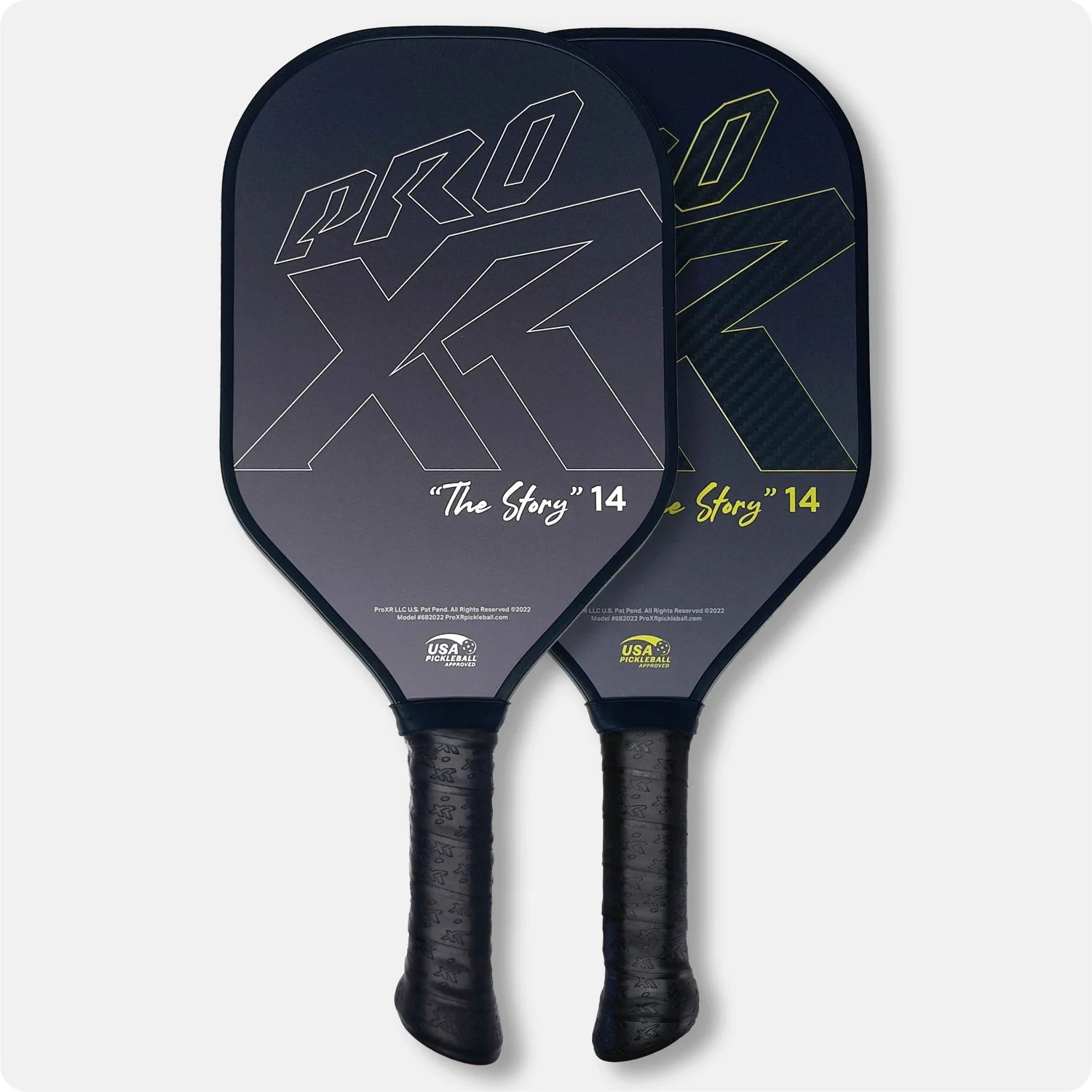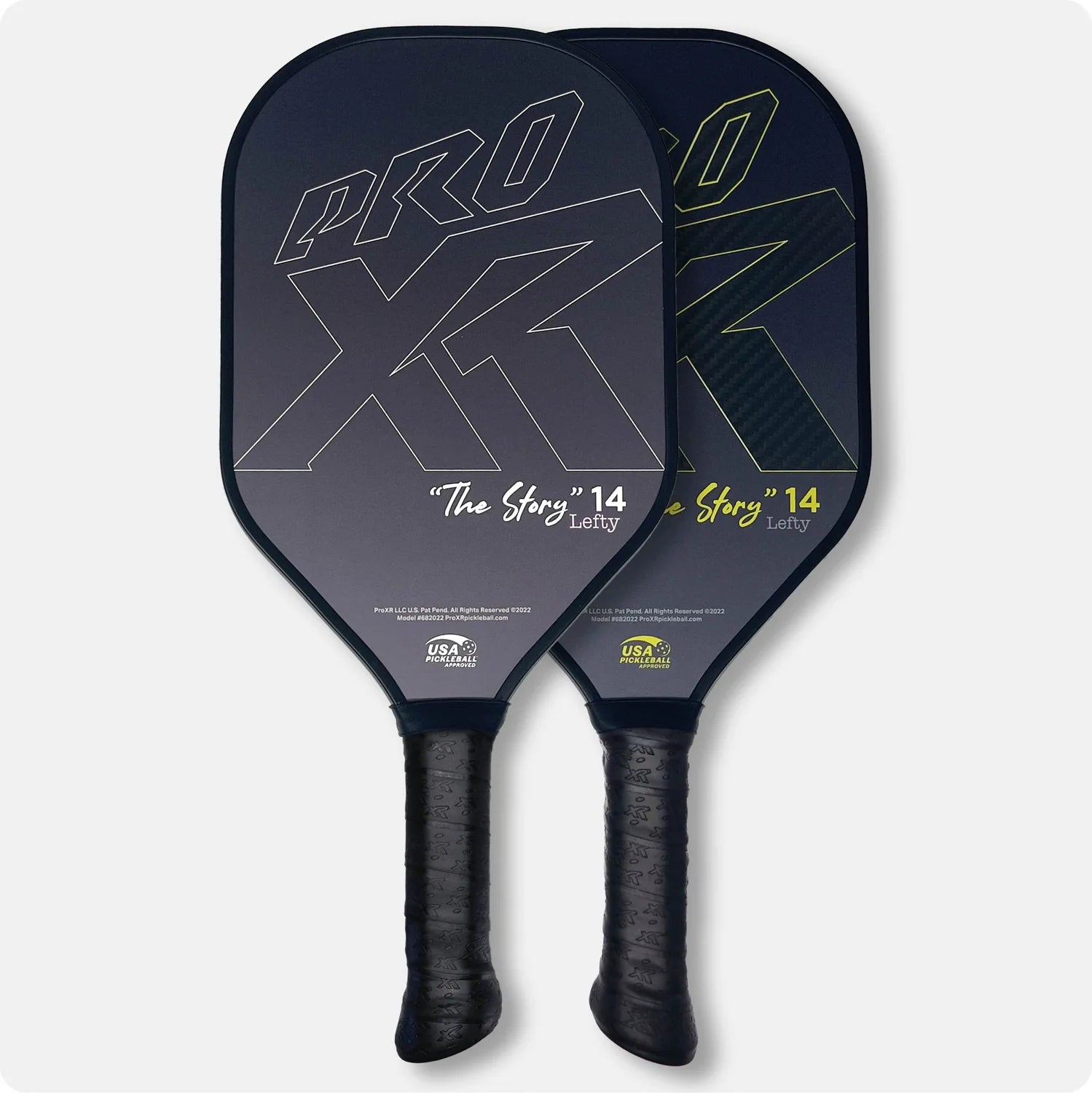“The Story” is the first and only paddle to overcome compromise. ProXR Pickleball has combined two of its most popular models - the Advantage (fiberglass) and the Signature (carbon fiber weave) - to create a paddle that fits all elements of your game. The forehand features premium fiberglass to rip drives and maximize spin. The backhand features carbon fiber to allow for optimal touch and control. With an XR-23 handle for an additional layer of leverage, “The Story” is pickleball’s first ever triple-threat paddle.